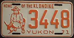1971 | Orange on white with border line; orange embossed prospector at left with gold paint speck; "YUKON 71" at bottom | Home of the Klondike | 1234 | 1 to approximately 6300 | |