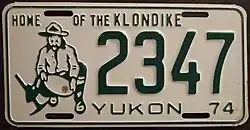 1974 | Green on white with border line; green embossed prospector at left with gold paint speck; "YUKON 74" at bottom | Home of the Klondike | 1234 | 1 to approximately 8000 | |