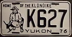 1976 | Black on white with border line; black embossed prospector at left with gold paint speck; "YUKON 76" at bottom | Home of the Klondike | A123 | Coded by region (A) | Letters A, B, C, E, J, K, L, N, P and T used in Whitehorse, D in Dawson, F in Faro, H in Haines Junction, M in Mayo, and W in Watson Lake. This continued through 1981.[2] |