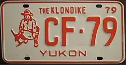 1979 | Red on white with border line; red embossed prospector at left with gold paint speck; "YUKON" centred at bottom and "79" at top right | The Klondike | AB-12 | Coded by region (A) | Final single-year passenger plate in Canada. |