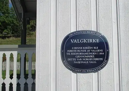 In 1814, this church served as an election church (Norwegian: valgkirke).[6][7] Together with more than 300 other parish churches across Norway, it was a polling station for elections to the 1814 Norwegian Constituent Assembly which wrote the Constitution of Norway. This was Norway's first national elections. Each church parish was a constituency that elected people called "electors" who later met together in each county to elect the representatives for the assembly that was to meet in Eidsvoll later that year.[6][8]