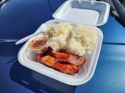 The average price of a meal is less than $15 and restaurants are open all day for breakfast, lunch, and dinner.[106] Individual restaurant stalls and a food court serve traditional Hmong and Southeast Asian meals, snacks, and street food.[107] Because Hmong are a diaspora, Hmong cuisine is a fusion, so dishes at Hmongtown come from Thailand, Laos, Cambodia, Vietnam, and even China, Japan, South Korea, and Mexico. Difficult to find outside of Minnesota, Hmong-style barbecue is prominent, including traditionally prepared and cold Hmong sausage (nyhuv ntxwm hmoob), which is a pork sausage flavored with Thai chili and herbs like lemongrass, and sai krok, a traditional fermented pork sausage.[58][108][109][110][111] Dishes popular among Hmong such as pho (or the Hmong version of pho called fawm[112][113]), khaub poob (red curry noodle soup),[114][115] larb (minced meat salad), nab vam (tapioca dessert), purple rice,[25] boba tea, mangonada,[116] and papaya salad are widely available from multiple restaurants.[117][118][119]