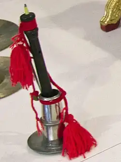 The hne (Burmese: နှဲ)has a sextuple reed (called hnegan), made from the young leaf of the toddy palm, which is soaked for six months.[1] The body of the hne is made of wood, with a conical bore and seven finger holes at the front, set in a straight line, with a bell (ချူ, chu) hung at the top.[1] It has a flaring metal bell and has a loud tone, and is used in an ensemble together with xylophone, tuned gongs, and tuned drums. There are two distinct forms: the smaller form is called the hne galay (နှဲကလေး), while the larger is called the hne gyi (နှဲကြီး). The former is used for songs in the ordinary key of the diatonic major scale, while the latter is used for grand style songs in the subdominant mode.[2]