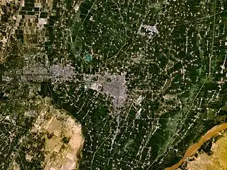 Yinchuan[a] is the capital of the Ningxia Hui Autonomous Region, China,[4] and was the capital of the Tangut-led Western Xia dynasty. It has an area of 8,874.61 km2 (3,426.51 sq mi) and a total population of 2,859,074 according to the 2020 Chinese census, and its built-up area was home to 2,564,918 inhabitants spread between three urban districts and Helan and Yongning counties largely being urbanized. The city's name literally means "silver river".
