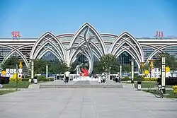 Since 1958, the city has been served by Yinchuan railway station on the Baotou–Lanzhou railway integrating it in the Chinese railway network.[33] The Taiyuan–Zhongwei–Yinchuan railway opened in 2011. Since the opening of the Yinchuan–Zhongwei high-speed railway in 2019, Yinchuan is also served by high-speed train services.[34]