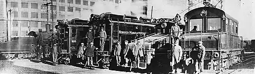 By 1911 the railroad had four electric locomotives in operation, and switched between 100 and 150 cars daily.[12] Electric operation was ceased in the 1930s when the GE boxcab diesel locomotives arrived.[13] 1938 brought an Alco HH660 series locomotive and 1947 two GE 44 ton switchers.