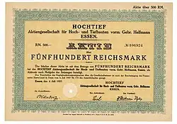 The firm grew rapidly, but was not comparable with the major German construction companies of the era. In 1921, it attracted investment from the industrialist Hugo Stinnes (described by Time as the "New Emperor of Germany" for his wealth and influence) and in 1922, the firm moved its base to Essen as part of its integration into the Stinnes group.[12] Stinnes planned to use Hochtief for all his construction projects, while Hochtief saw an opportunity to profit from the Treaty of Versailles, organising the delivery of construction materials to France as part of German reparations for World War I. Stinnes died in 1924,[13] and within a year his industrial empire collapsed. With the help of several banks, the company (now known as Hochtief Aktiengesellschaft für Hoch- und Tiefbauten vorm. Gebrüder Helfmann) avoided insolvency. In the aftermath of the Stinnes collapse, the major utility RWE and electrical equipment producer AEG became major shareholders in Hochtief, and Hans Weidmann stepped down in 1927.[9][14]