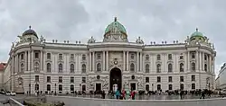 Older castle sections (left), Neue Burg section (center of image) and Outer Castle Gate (separate on the right), in foreground the Heldenplatz. | |