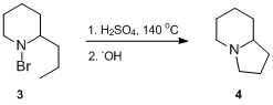 1‑bromo-2‑propyl­piperidine (3) and hot sulfuric acid, followed by basic work-up, formed a tertiary amine,[5][6] later identified as δ-coneceine (4).[7]