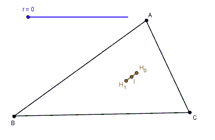 Animation showing various Hofstadter points. H0 is the Hofstadter zero-point. H1 is the Hofstadter one-point. The little red arc in the center of the triangle is the locus of the Hofstadter r-points for 0 < r < 1. This locus passes through the incenterI of the triangle.