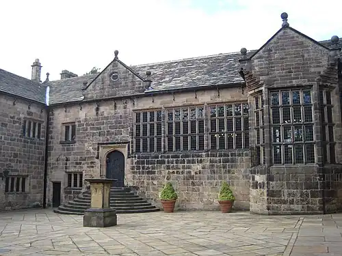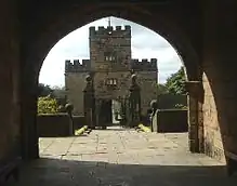 The house is approached by a long straight drive leading eastwards from the A675 road. It passes through a pair of gate piers about 200 yards (183 m) west of the house.[28] Between these gates and the entrance to the outer courtyard is a grassed area known as the Tilting Ground, which is enclosed by a wall on the south side and the Great Barn to the north. On the east side of the house is a walled garden, known as the Wilderness, and on the south side are smaller walled gardens, the Rose Garden and the Rampart Garden.[22] The Great Barn is constructed in sandstone with a slate roof, and incorporates a cart house. It is dated 1692, and has ball finials on its gables. To the northwest of the house are the coach house and stables, also in sandstone, and dating from the 17th or early 18th century. A small cupola was added to it in the 19th century. At the entry to the drive on the main road is Paley and Austin's lodge of 1878.[22]