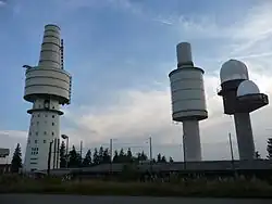 A NATO listening post for the so-called Communication Sector F, also located here, was shut down in 2004. As well as members of the Bundeswehr, American units were stationed there until 1992 and French units until 1994. It consisted of two towers and a complex passive reception and monitoring system. Since autumn 2014, the 75-metre-high main tower has been fitted with an externally-mounted steel staircase and a viewing platform at a height of 50 metres and is open to the public as a viewing tower at certain visiting times.[2] In the medium term, various media in the area of the stairs and viewing platform will be used to inform visitors about the history of the site and its planned future use as a European meeting centre.[3] The owner of the facility is the Hoher Bogen Mountain Resort.