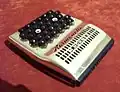 The Hohner Electravox is an electronic accordion made in the late 1960s and early 1970s, which has one channel (combined left hand and right hand) or two channel (separate left hand and right hand channels, which enables independent volume changes), 92 bass/chord buttons, keyboard percussion effect for the bass buttons and keyboard, a vibrato effect (with slow/fast options), and a separate power supply unit, which sits on the floor.[49] The Electravox had 16', 8', 5 1/3', and 4' registers.[49] The tuning for the Electravox could be changed to match another instrument, such as a piano or organ, but this required changing all 12 master tone generators with a special tool.[49]