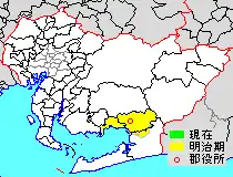 The villages of Gamagōri and Uchikubo were elevated to town status on October 6, 1891. They were followed in rapid succession by the village of Shimoji (October 16, 1891), the village of Goyu (January 29, 1892), the village of Toyokawa (March 13, 1893), the villages of Akasaka and Kō (June 23, 1894), and the village of Miya (December 10, 1894). In a round of consolidation, the remaining number of villages was reduced from 25 to 11 in 1906. The district office was transferred to the town of Kō in 1923. The village of Katahara was raised to town status on April 1, 1924, the village of Kosakai on September 12, 1926, and the village of Mito on February 11, 1930. On September 1, 1932, the town of Shimoji was annexed by the neighboring city of Toyohashi. The city of Toyokawa was formed on June 1, 1943 by the merger of the towns of Toyokawa, Ushikubo and Kō, and the village of Yawata. The village of Nishiura was raised to town status on February 11, 1944.