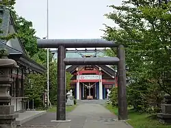 Hokumon Jinja (北門神社) is a Shinto shrine in Wakkanai, Hokkaidō, Japan. In Tenmei 5 (1785), Matsumae Domain trader and agent Murayama Denbee (村山伝兵衛) (1738–1813) is said to have founded the small shrine of Sōya Daijingū (宗谷大神宮), enshrining Amaterasu as guardian of the north gate.[1][2] In 1896 the shrine was transferred to its current location and renamed Hokumon Jinja, with Takemikazuchi and Kotoshironushi enshrined alongside Amaterasu. In 1902 work on the shrine buildings was completed, but on 17 May 1911 the whole complex was destroyed by a wild fire. The year 1913 saw the rebuilding of the honden and haiden and in 1916 Hokuman Jinja was ranked as a Village Shrine. In 1925 the shrine offices were donated and in 1933 Hokumon Jinja was promoted to the rank of District Shrine. The hexagonal shrine mikoshi was dedicated in 1949 and in 1978 the new shrine building was completed and a transfer ceremony held.[1]