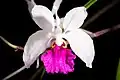 The flowers are white and wide open. The lip is three-lobed. The lateral lobes are erect and dotted adaxially. The central part is spread out over a large area and is parallel to the gynostemium. The lip is shaped to allow potential pollinators to depress the middle lip. The flowers have an elongated spur, which is strongly reduced in the subgenus Brachycentron. The gynostemium has a large scar area. The stamen contains two separate pollina. The stipes connecting the pollina and the adhesive disc (Viscidium) bend in the middle when removed from the rostellum. The rostellum is deeply incised.[4] The number of chromosomes is 2n = 38 in almost all species. Holcoglossum tsii has 76 chromosomes in the diploid chromosome set (2n = 76).[5]