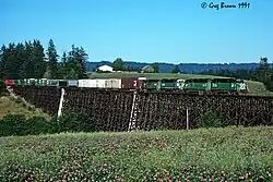 The trestle was completed in around 1911 for the United Railways, a now-defunct railway which ran from Portland to Wilkesboro.[3] It was rebuilt in 1947.[4] A connection to the Oregon Electric Railway was later added.[5] It was used by Burlington Northern Railroad (which merged into BNSF Railway in 1995) until the mid-1990s, and was known by that company as "Bridge 16.7". The Holcomb Creek Trestle is currently operated by Portland and Western Railroad.