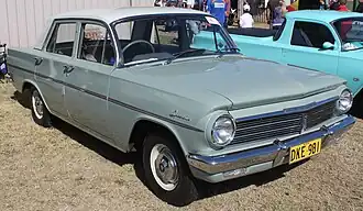 The Holden EH is an automobile produced by Holden in Australia from 1963 to 1965. The EH was released in August 1963[1] replacing the Holden EJ series, and was the first Holden to incorporate the new red engine, with a seven main bearing crankshaft instead of the four main bearing crankshaft used in the grey engine. The newly released Red engine initially came in two capacities that being the 100hp 149 and the 115hp 179 cubic inch displacement. Standard issue on all models (except Premiers) was the 149 CID in either the manual or Hydramatic transmission. A lower compression 95 hp 149 was also available as an option, except on Premiers. The Premier models only received the larger 179 (HP cast block) and initially only with the Hydramatic transmission. The Hydramatic was a four-stage automatic transmission with a column shift although it effectively worked as a three-speed unit,except at full throttle.[2] The manual transmission was a 3 speed column shift with non synchromesh first gear with synchromesh only on the second and third (top) gear. The first EH with a 179 CID engine combined with a manual gearbox was called the "EH-S4", (officially EH225M-S4) and was fitted with an upgraded manual gearbox, having stronger gears than in the 149 gear box. Other upgrades included clutch and brakes and a few other minor changes. The mainstream release of the 179 engine mated to the three speed manual transmission option across all models occurred on 10 February 1964.
