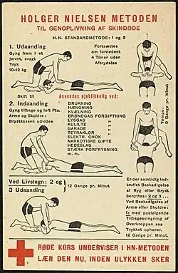 Nielsen is also credited with developing an early set of rules for handball in 1898,[3] and with developing a form of external cardiopulmonary resuscitation called the Holger Nielsen method in 1932. The National Research Council gave support to this method in 1951, however, it was superseded by mouth-to-mouth resuscitation in recommendations of 1958. (Artificial Respiration, the history of an idea. A B Baker Med Hist. 1971 15(4): 336-351)