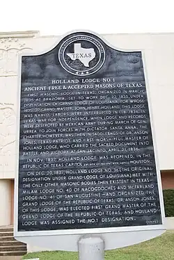 - ^ Texas State Historical Survey Committee (1970). "Holland Lodge No. 1 Ancient Free & Accepted Masons of Texas, State Historical Marker #10686". THE HISTORICAL MARKER DATABASE. Archived from the original on November 30, 2023.