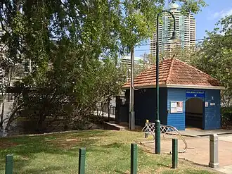 The Holman Street Ferry Terminal is on the bank of the Brisbane River at the end of Holman Street, Kangaroo Point next to Captain Burke Park. Trees flank a small timber waiting shed and the river bank on either side of the shed is supported by a retaining wall. This extends about 13 metres (43 ft) to the north and about 30 metres (98 ft) to the south between the ferry and the Brisbane Jazz Club building. The longer section of wall is composed of dressed blocks of Brisbane tuff; on the northern side it is composed of concrete and irregularly placed pieces of tuff. The terminal is approached from the riverside by a pontoon and from the landward side by a pathway and concrete apron entrance leading into the terminal. On the northern side of the entrance there are plantings of shrubs and a bauhinia tree. To the south is a grassed area with two large mature trees. The modern pontoon structure and the mangrove trees in the water along the retaining wall hide the waiting shed from the river.[4]
