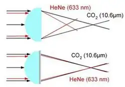 Holo/Or's Dual Wavelength lens was the first commercial DOE in the world. These lenses correct the strong chromatic and spherical aberrations between a CO2 laser and its red aiming, and unite both beams to a single diffraction-limited focal point beam, by the use of a diffractive surface pattern. This product continues to be used in surgical laser systems and FTIR systems.