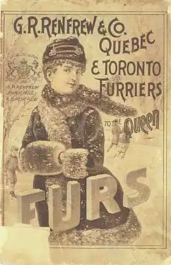 By the middle of the 19th century, the company had begun promoting its fur garments beyond Quebec to a larger North American and European market.[7] An 1890 mail order fur catalogue listed nine different medals and diplomas won at London, Paris, and Philadelphia exhibitions from 1851 to 1888.[8] During its history, the store served many notable patrons. Admirers of John A. Macdonald, Canada's first Prime Minister, had decided the coat he had worn during an 1883 visit to Quebec City was not befitting his status as first minister and bought him a new fur coat from the company.[9] Then, in 1886, G.R. Renfrew & Co. received its most prestigious honour, being named "Furriers in Ordinary" by Her Majesty Queen Victoria. The Queen had purchased a number of fur items from the company's display at the Indian & Colonial Exhibition held that year at London, England. The Quebec Daily Telegraph wrote at length about the appointment: