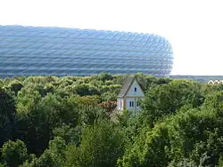 With the construction of the nearby Allianz Arena, an international competition for an artwork was initiated which was won by Timm Ulrichs. The focus was on the disappearance of the former village of Fröttmaning. Approximately 150 meters south of the Holy Cross Church, in 2006, an inaccessible replica of the Romanesque church was created in original size from painted precast concrete parts. The surreal-melancholic work of art "sunken village" at the foot of the Fröttmaning mountain of rubble is a kind of a loss display, the disappearing in this place. The copy was arranged in such a way that the building seems half buried from the mountain.