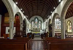 Holy Cross is built of stone rubble with freestone dressings and slate roofs. It is made up of a nave, north and south aisles, chancel, vestry, south porch and west three-stage tower. Many of the 1885–86 windows are in the Perpendicular style. The chancel's south window dates to the 15th-century and the north window to the 13th-century. The church contains a double piscina and triple sedilia, both of which are dated to the 13th or 14th-centuries.[2]