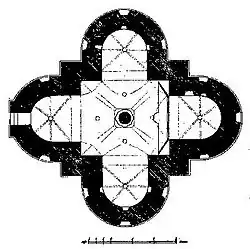 In 1476 the fortress was rebuilt into a church with a brick ribbed vault on the first tier and Gothic nervures above the second tier of the central space. In the 16th century, the walls of the first tier were painted with frescoes; fragments of them have survived to this day.[2]