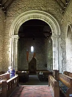 The font is of the late 12th century; it is an octagonal block with two shallow arches carved on each side, supported by a thick central shaft and four slender shafts.[4][6]