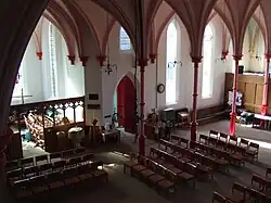 In 1852 a new organ was installed in the west gallery, and in 1861-2 new heating apparatus was installed. In 1866 the first marble wall monument was erected. In 1871 the south transept was turned into a side chapel for weekday services. To mark the church's 50-year jubilee in 1888, the west gallery was removed and the organ moved to the chancel area and choir stalls added alongside. The font was moved to the west gallery at the same time. In 1898 the west end of the church was partially re-seated.