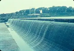 The second dam which would define the city's industrial prowess in the 19th century was completed the following year in 1849. Initially built as effectively a wall of wooden timbers, concerns eventually arose that the water's velocity pouring over the dam was eroding the rocks upon which it stood, and it was described by a paper of the Engineers' Club of Philadelphia as "simply built with the wrong face up stream", where a sloping structure in the opposite direction would have been ideal.[7] Furthermore the vibration of the waterfall on the rocks led to synchronous vibrations in doors and windows on many of the surrounding mills and worker housing. To remedy this, from 1868 to 1870 an apron was constructed of large timbers and rocks which mitigated the aforementioned vibrations,[8] however the angle at which it sloped and the geology of rocks immediately below only ensured that the erosion continued.[9] As early as 1884 the Holyoke Water Power Company, manufacturers, and city officials called for the construction of an improved stone structure which would address these issues and ensure the sustainability of the hydropower in the future, a considerable undertaking at the time as the wooden dam was then the 2nd largest dam in the country at that time by length, exceeded only by the Fairmount Dam in Philadelphia.[8] In a conference with the city's manufacturers that year, the Water Power Company announced it had begun a fund toward the development of the replacement dam, which would not see construction commence until 11 years thereafter, and completed in nearly 16.[8]