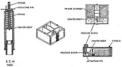 The body of the Holzmine 42 consisted of a wooden box divided into four compartments by with removable partitions. The two side compartments contained the main explosive filling of 5.4 kg (12 lb) Amatol that was waterproofed with bitumen, while the center compartment contained three 200 g (7 oz) waterproofed primer charges, and the end compartment contained the operating mechanism.[1] The end compartment contained a rectangular shearing flange secured to the outside wall of the box by two 9.52 mm (0.375 in) wooden dowels and a pressure of approximately 91 kg (200 lb) sheared the dowels and forced the flange down onto the igniter pin and freeing the spring-loaded striker. The Holzmine 42 could also be fitted with an anti-tamper device which consisted of a Z. Z. 35 fuze that screwed into a hole in the bottom of the box which connected to one of the primer charges.[1]