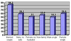 There is a strong correlation between the type and age of a household's family structure and homeownership.[24] As of 2006, married couple families, which also have the highest median income of any household type, were most likely to own a home. Age played a significant role as well, with homeownership increasing with the age of the householder until age 65, when a slight decrease becomes visible. While only 43% of households with a householder under the age of thirty-five owned a home, 81.6% of those with a householder between the ages of 55 and 64 did.[24] According to Zillow's data analysis, the median age of renters who are heads of households is age 41 years, up from age 37 in 2000.[25]