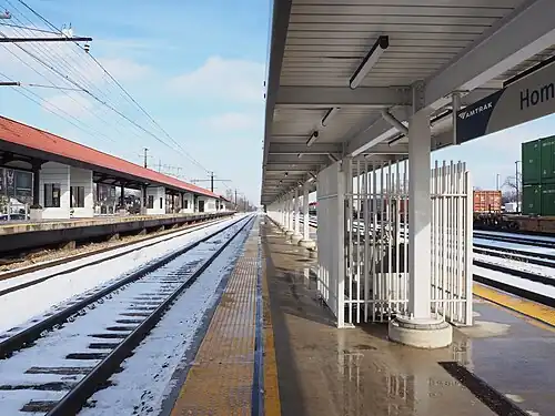 ![]() Homewood Amtrak platform in January 2025. The Metra tracks and platform are on the left. | ||||||||||||||||||||||||||||||||||||||||||||||||||||||||||||||||||||||||||||||||||||||||