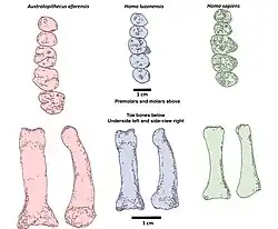 The finger bones are long, narrow, and curved, which is seen in Australopithecus, H. floresiensis, and sometimes modern humans. They are dorso-palmarly (from the palm to the back of the hand) compressed, and have well-developed flexor sheath attachment, which are seen in Australopithecus and the early H. habilis. Unique to H. luzonensis, the dorsal beak near the knuckle was strongly developed and angled towards the wrist rather than the finger. The foot bones are morphologically unique among Homo, and are distinguishable from those of A. africanus and A. afarensis. Australopithecus limbs are generally interpreted as being adaptations for bipedalism and potentially suspensory behavior in the trees, but the fragmentary record of H. luzonensis limits extrapolation of locomotory behavior.[1]
