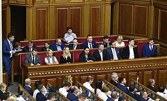 - The leader of Fatherland, Yulia Tymoshenko told journalists on 29 August 2019 that even though her party did not support the appointment of Honcharuk, her party would support the government (working outside the majority) and would not sit on the opposition benches. Less than three months later, the party moved into opposition due to its disagreement with the government's plan to remove the long-standing moratorium on selling agricultural land.[3]