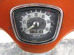 The plastic fairing ran from below the handlebars and under the footpegs, protecting the rider's legs from wind and road debris, as well as hiding the engine from view. This design was like the full enclosure of a scooter, but unlike a scooter, the engine and gearbox unit was not fixed to the rear axle. This had several benefits. It moved the engine down and away from the seat, detaching the rear swingarm motion from the drivetrain for lower unsprung weight. It also made engine cooling air flow more direct, and made it possible to fit larger wheels.[6] Placing the engine in the center of the frame, rather than close to the rear wheel, greatly improved front-rear balance.[7] The fuel tank was located under the hinged seat, which opened to reveal the fuel filler inlet. The 17 inch wheels, in comparison to the typical 10 inch wheels of a scooter, were more stable, particularly on rough roads, and psychologically made the motorcycle more familiar, having an appearance closer to a bicycle than a small-wheel scooter.[6]