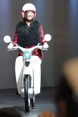 Without the engine in the center of the frame or the fuel tank under the seat, there was room for a scooter-style underseat helmet compartment.[67][68][69] Integrated with the new electric motorcycle was an interactive communications system, to let riders converse while riding.[70] Several other companies, including Christini, KTM, Öhlins, and Yamaha have done development on two-wheel drive motorcycles, and have found that the addition of power to the front as well as the rear wheel aids in stability, particularly in corners and in the hands of novice riders.[67][71] At the time Honda hinted that they would bring the EV-Cub to market in 2010.[67] In a 2016 speech, Honda's president and CEO Takahiro Hachigo said they planned to release the EV-Cub in Japan in about two years, followed later in other ASEAN markets.[72]