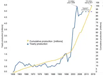 ![]() Annual Super Cub production from 1958 through 2008, the year cumulative production passed the 60 million units milestone.[40] | |