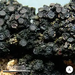 | Hondaria leptospora; image shows ornamented apothecia with granular isidia on the margin. Scale bar is 5 mm | |
