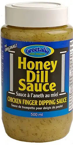Honey dill or honey dill sauce is a condiment consisting of honey, mayonnaise, and dried dill that is unique to Manitoba, Canada.[1] It is often used as a dipping sauce for chicken fingers as well as for sweet potato fries.[2] The sauce was mistakenly invented at Mitzi's Chicken Finger Restaurant in downtown Winnipeg.[3] The restaurant specialized in chicken fingers, the meal for which the sauce is mostly used. Its owner tried to copy a different recipe by taste from another restaurant, but got the recipe wrong.[2] The accidental sauce was so popular at the restaurant, that it took off locally in the province. President's Choice marketed a brand nationally, however, sales outside Manitoba were too slow. Today, most production is done by a local Winnipeg producer, or in-house at restaurants.[2]