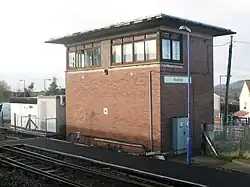 A signal box was built in 1875 at the Exeter end of the station on the south side of the line. This was replaced by a new building on 16 June 1957 which was on the opposite side of the tracks. On 11 June 1967 the line from Chard Junction to Pinhoe was reduced to a single track[17] but a loop line was retained at Honiton to allow trains to pass midway on this 29-mile (47 km) section. The westbound platform was signalled to allow eastbound trains to use it when they are not crossing a train coming in the opposite direction. In December 2009 a new loop was installed at Axminster to break up the section towards Chard. One siding was retained to the west of the signal box, worked by a ground frame rather than from the signal box itself,[18] however this has now also been lifted.