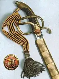 The majority of those awarded personalized weapons in the Soviet Union occurred during the Great Patriotic War[21] (at the same time, there were cases of awarding distinguished snipers with personalized sniper rifles,[22] at least several infantrymen were awarded PPSh-41 submachine guns[23] and on May 1, 1944, a personalized machine gun was awarded). There are known cases of awarding captured weapons. There were cases of presenting personalized bladed weapons as a collective award (for example, the Sword of Stalingrad).