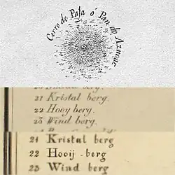 The hill has had various names throughout the years. In Spanish, it was called Cerro de Paja ó Pan de Azucar, meaning "hill of straw", "sugar bread", or "sugarloaf".[5][6] Sugarloaf refers to refined sugar shaped into a tall conical form, which was sold before the 1900s. Hooiberg is one of several formations named after Cerro Pan de Azucar (such as Pan de Azucar Island in the Philippines or Sugarloaf Mountain in Brazil). The Dutch gave it their own name, and the spelling of Hooiberg has changed over time, appearing as Hooy berg and Hooij-berg.[7][8] The name itself is a combination of hooi, meaning "hay", and berg, meaning "mountain", "mound" or "pile".[9] The hill is said to resemble a loose haystack or a hay barrack (Dutch barn), which explains the name Hooiberg.[10][11]