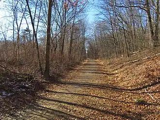 The trail was originally part of the Hartford, Providence and Fishkill line from Hartford to Willimantic which was completed in 1849.[1] Freight trains used the line through the 1960s. The last train ran on September 29, 1970, by which time the line was part of the bankrupt Penn Central.[2] The Willimantic section of the trail was built in 2015, unlike the rest of the trail.