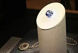 Color: It has been described as being a "fancy dark greyish-blue"[14] as well as "dark blue in color,"[17] or having a "steely-blue" color.[18]Blue diamonds similar to the Hope can be shown by colorimetric measurements to be grayer (lower in saturation) than blue sapphires.[19] In 1996, the Gemological Institute of America examined the diamond and, using their proprietary scale, graded it fancy deep grayish blue.The Hope Diamond in the National Museum of Natural History, Washington D.C., 2014.[20] Visually, the gray modifier (mask) is so dark (indigo) that it produces an "inky" effect, appearing almost blackish-blue in incandescent light.[21] Current photographs of the Hope Diamond use high-intensity light sources that tend to maximize the brilliance of gemstones.[22] In popular literature, many superlatives have been used to describe the Hope Diamond as a "superfine deep blue," often comparing it to the color of a fine sapphire—for example, "blue of the most beautiful blue sapphire" (Deulafait)—and describing its color as "a sapphire blue."[21][5][23] Tavernier described it as a "beautiful violet".[14]