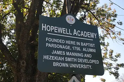 In 1756, Isaac Eaton the first pastor of the Old School Baptist Church established the Hopewell Academy. One of his students, James Manning, would go on to establish Brown University in 1765.[36]