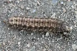 Larva clay coloured, darker dorsally: the dorsal line itself fine and white with dark edges; the subdorsal also fine and pale; laterally a pale dark edged serrate line containing the spiracles. The larvae are polyphagous feeding on various herbaceous plants including Beta vulgaris, Cynara scolymus, Medicago sativa and Taraxacum officinale.[3]